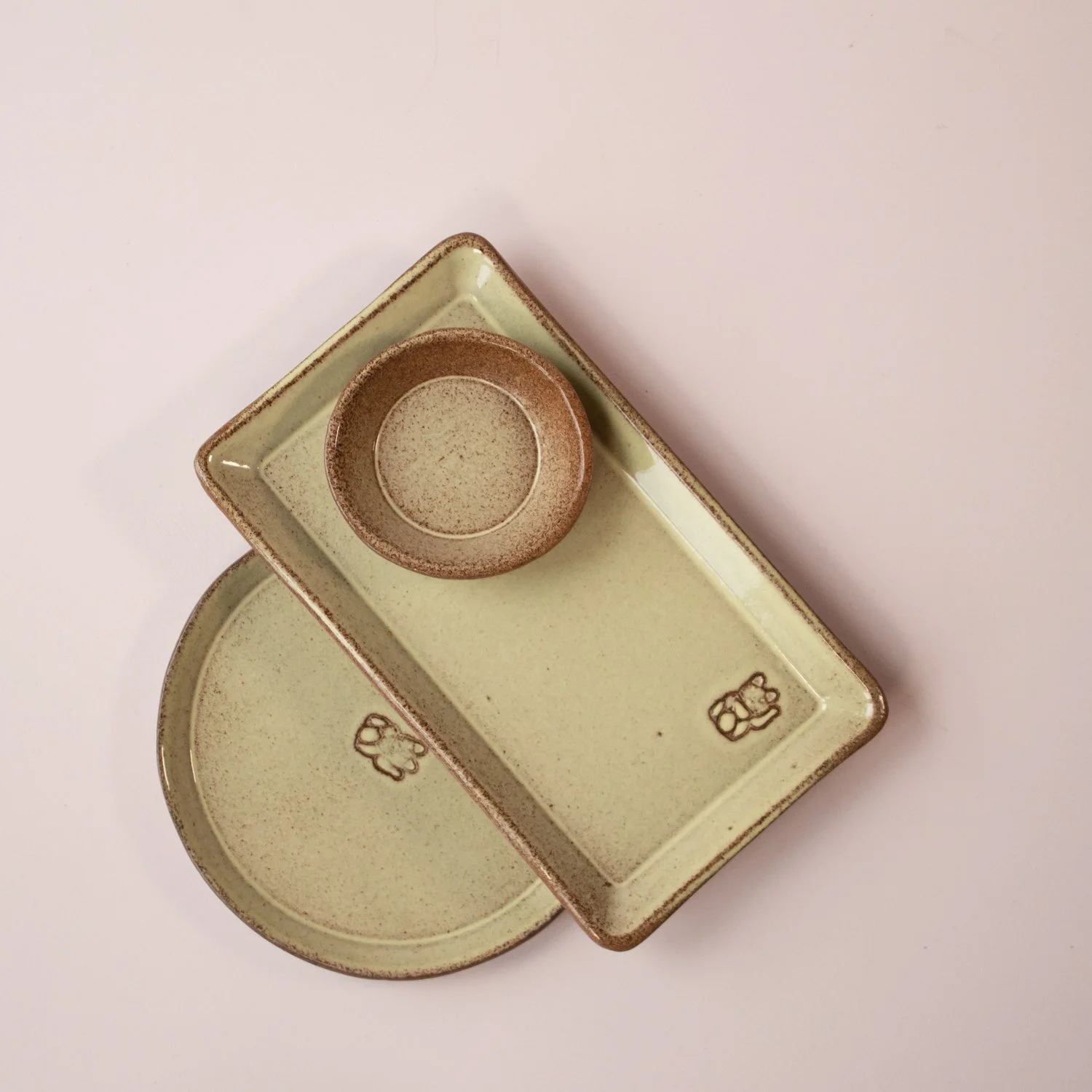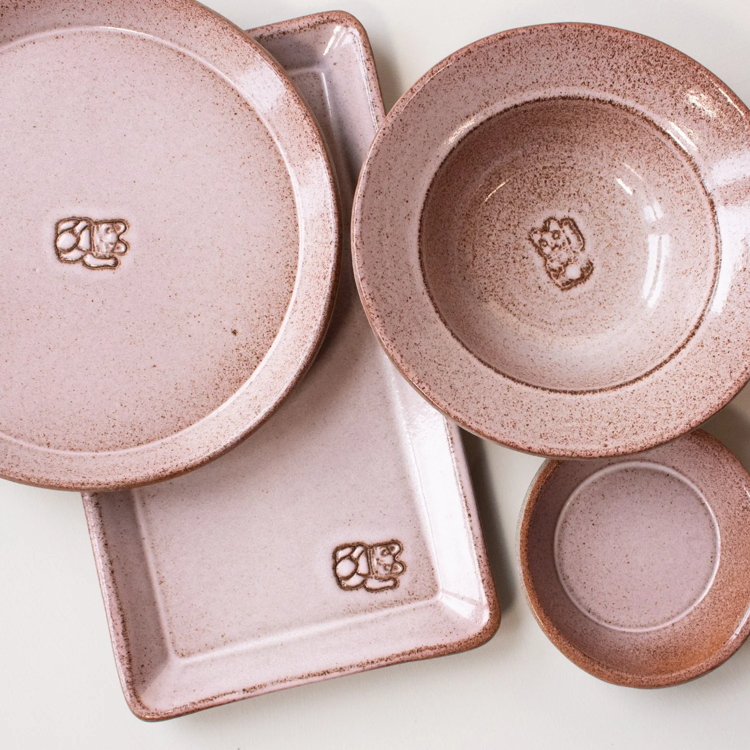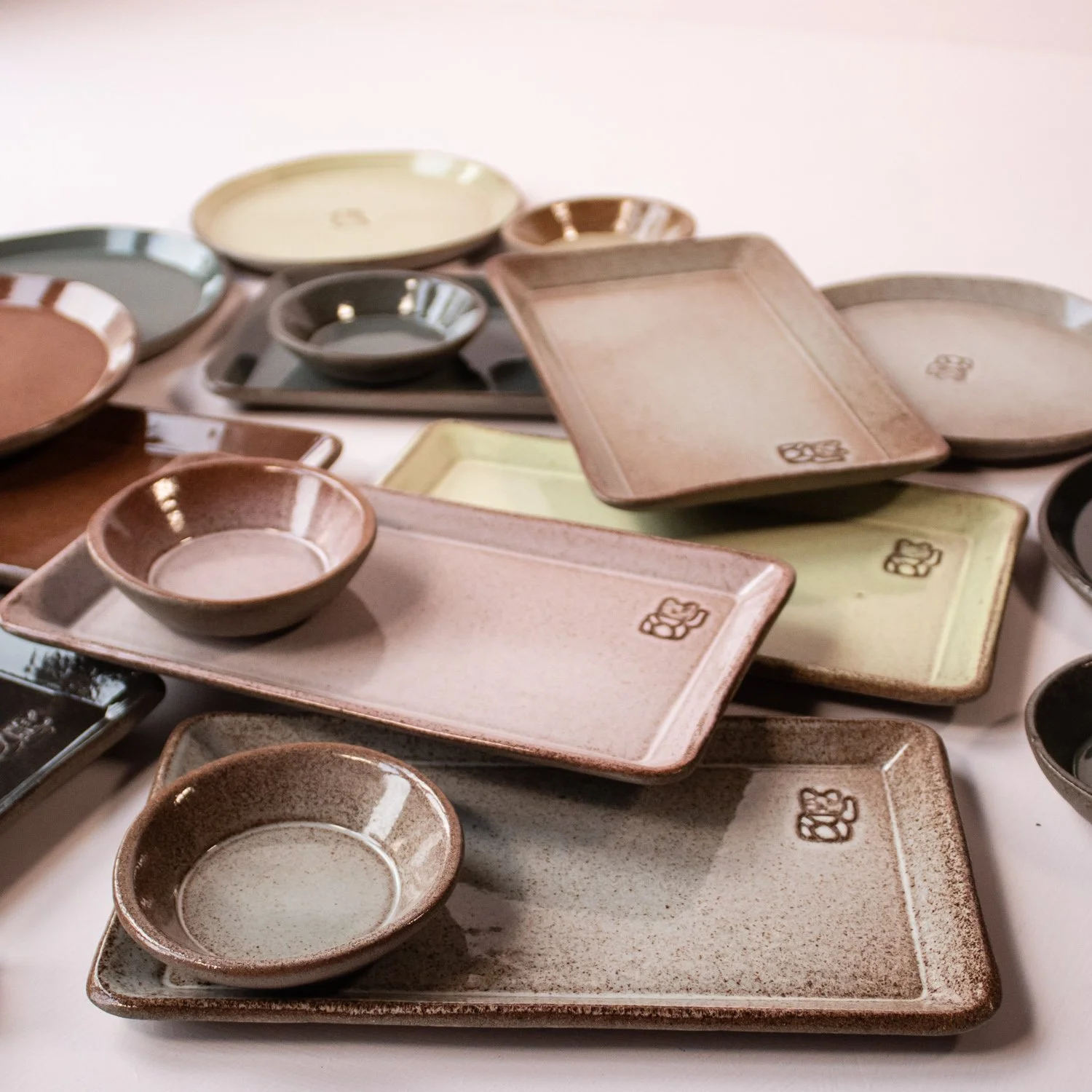 The gang is made up of rectangular plates, round plates, small bowls, soup bowls and cutlery rests, all in a strong clay glazed with muted colours.