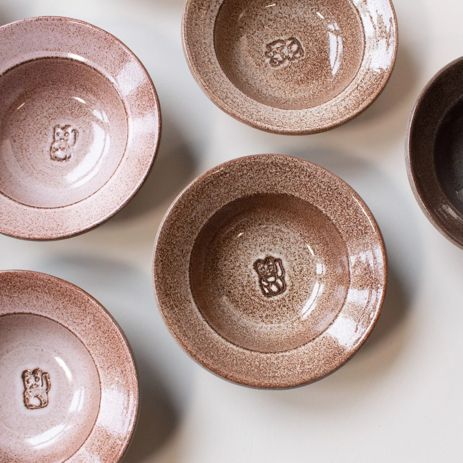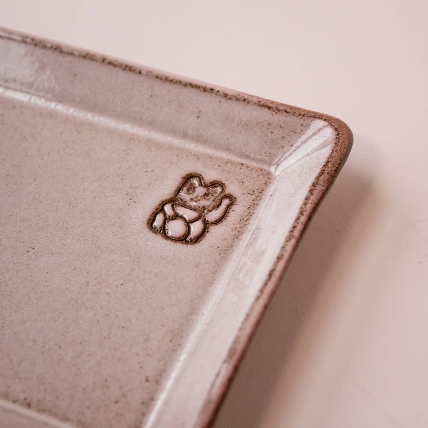 The waving cat is stamped into wet clay by hand, which creates a slight variation in depth and placement.