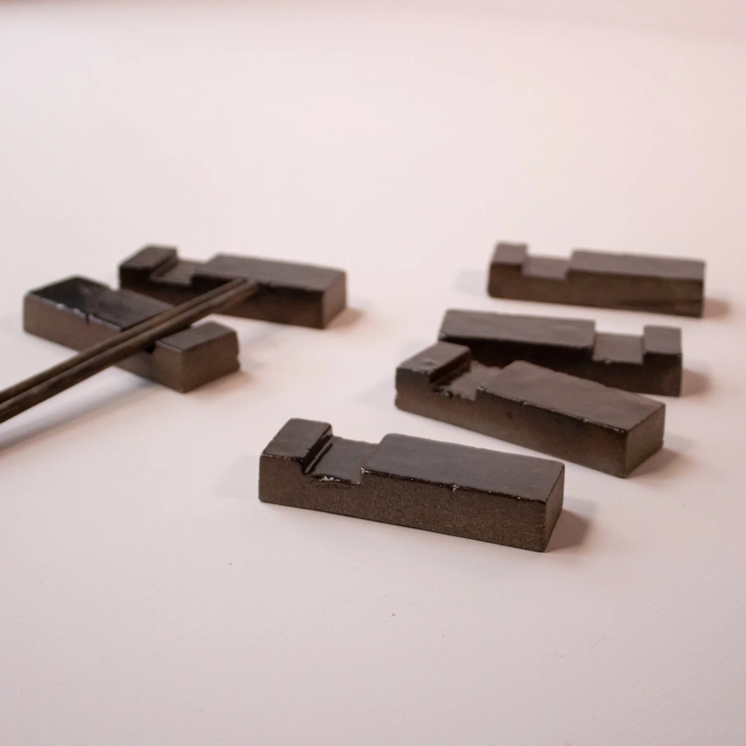 The cutlery rests are made by compressing clay in a sharp and precise mould, creating yet another meeting of the perfect and rough.
