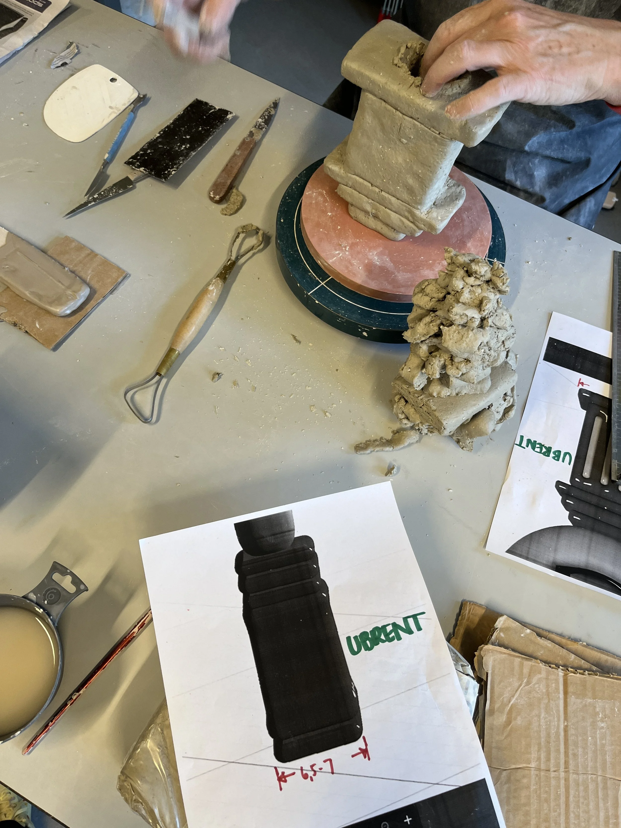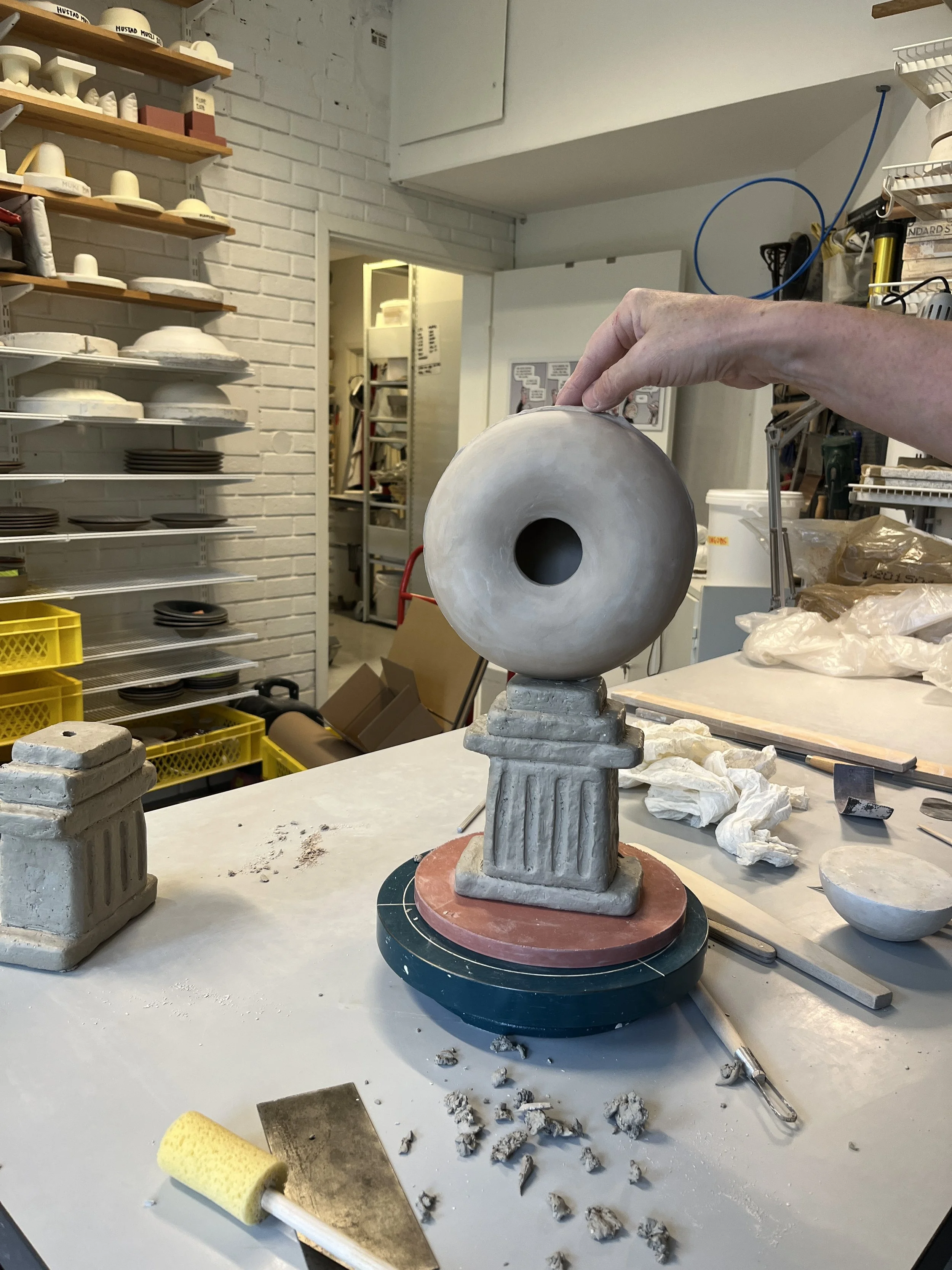 The grandest of the awards in the local Sterk Reklame contest is a very physical ceramic version of the 3d-illustration used on the general awards diploma. We were asked if it was possible to recreate the drawing in ceramic materials, and well, it was! The ancient Roman column is made from a very very coarse clay, in stark contrast to the inflated-looking colourful porcelain top.
