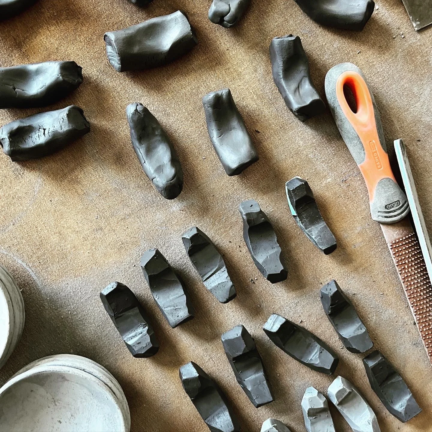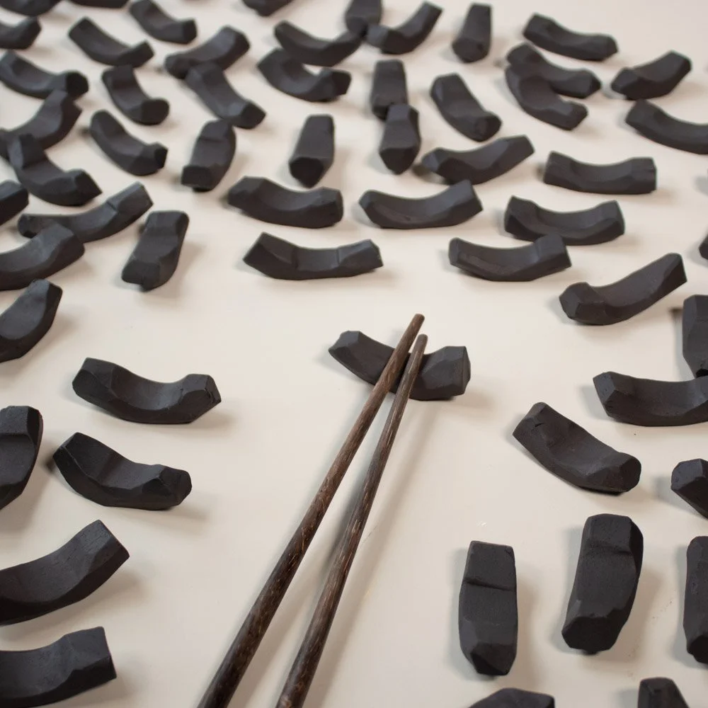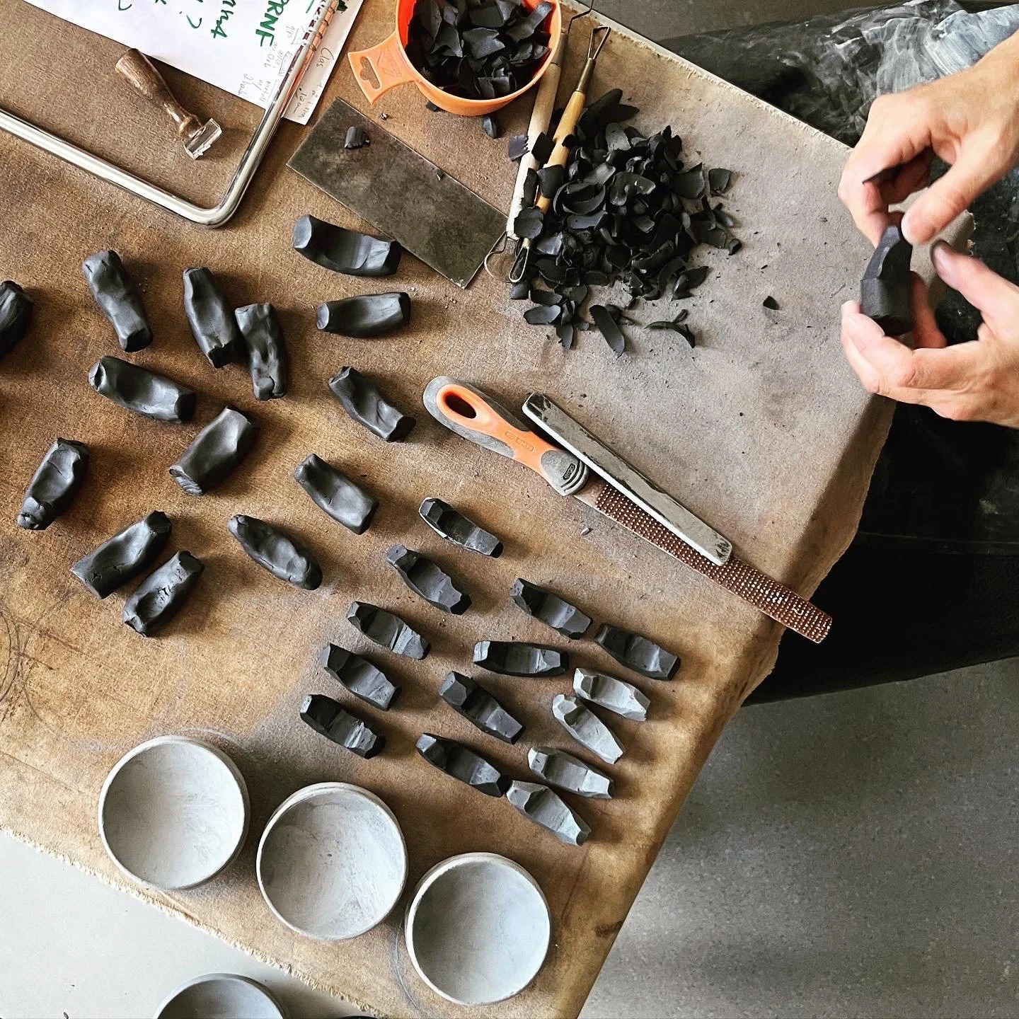Each of the little items is made entirely by hand - the chopstick rests carved out from a pre-shaped piece of clay in the right size and curve, and the soy dishes are made with the help of a cutting tool and a curved plaster mould to ensure the perfect size and shape.