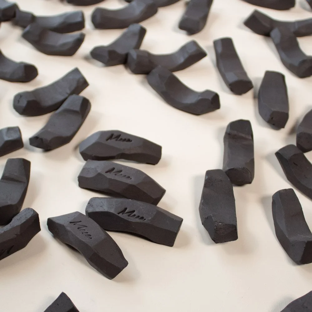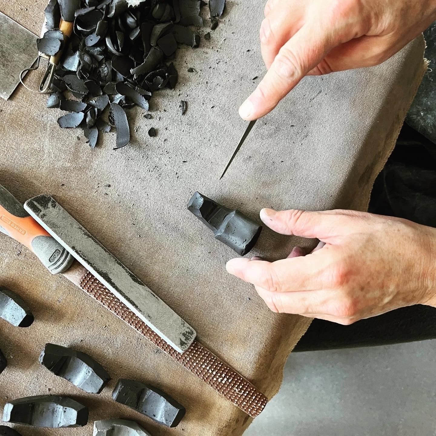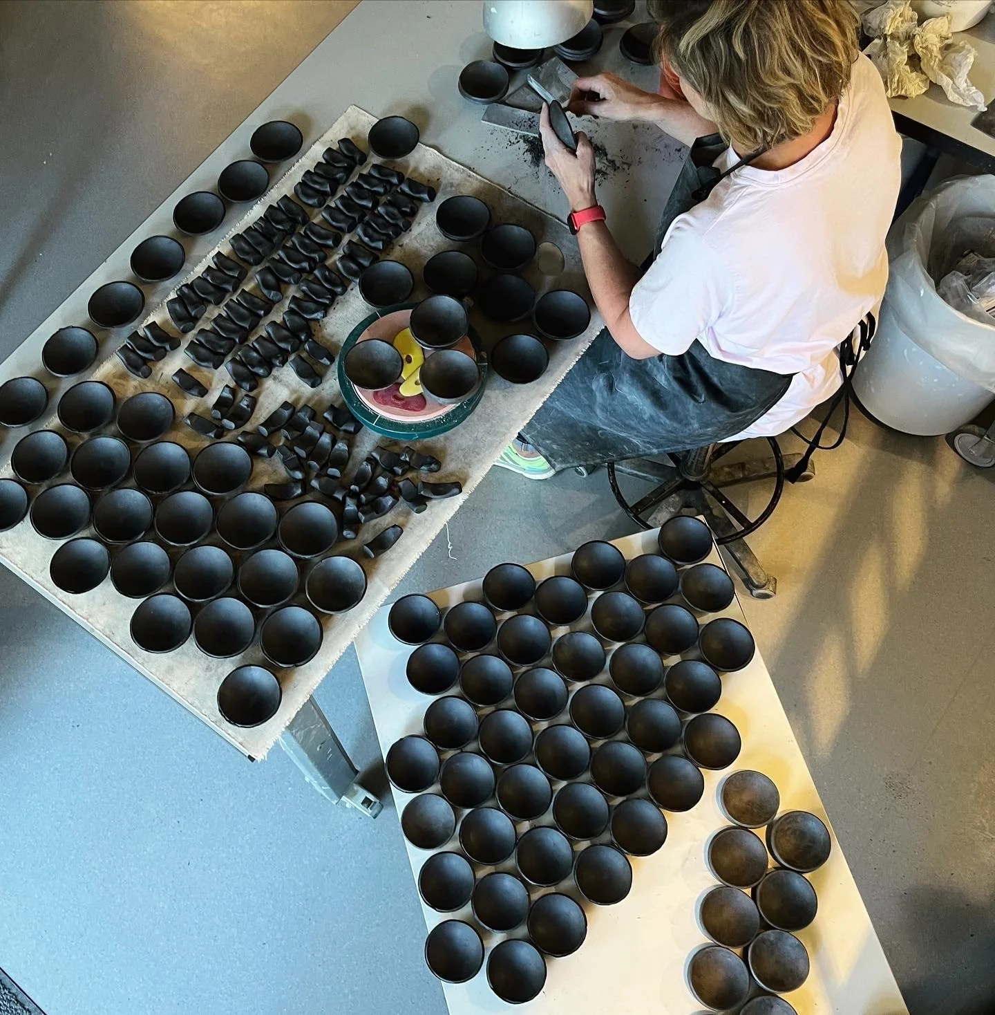 Each of the little items is made entirely by hand - the chopstick rests carved out from a pre-shaped piece of clay in the right size and curve, and the soy dishes are made with the help of a cutting tool and a curved plaster mould to ensure the perfect size and shape.